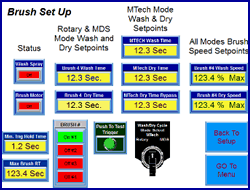 The brushes can be programmed to one of three available running modes and individual wash and dry times and running speeds. Additionally, shift start and stop times, installed brushes, chemical monitoring, and holding area cow cooling are able to be programmed. The system is also able to be setup for remote access monitoring and control.