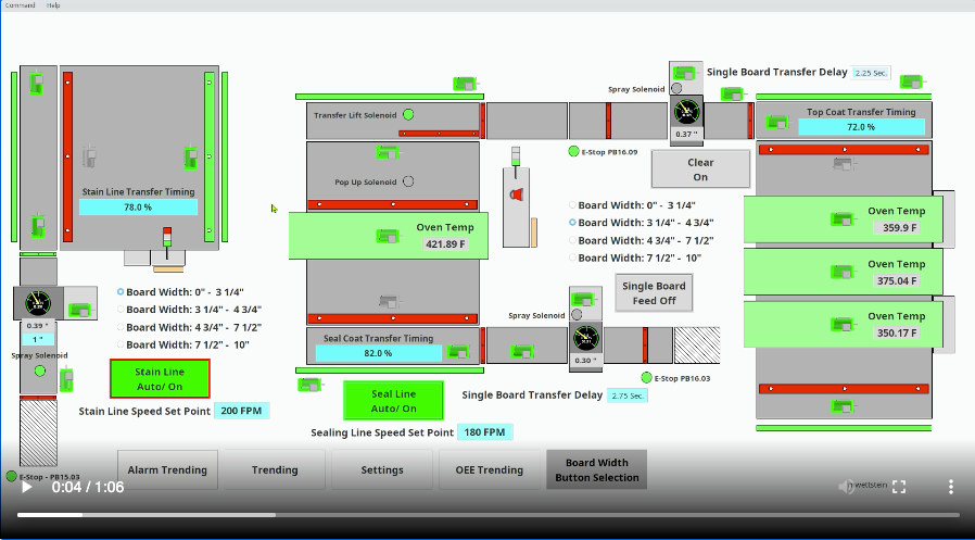 The system is started by an operator at the touch screen. Trim is fed into the system at various points depending on operation(s) required. As the trim is moving through the system it may be coated with the appropriate coating, air dried, and or heat dried. Oven temperatures, conveyor speeds, board feed rates and more are system adjustments made available to the operators. System security was added to protect critical features and setpoints from being inadvertently changed. OEE (Overall Equipment Effectiveness) was added for management visibility into the machine effectiveness. An OEE screen is accessible from any networked computer, in addition a daily report is sent to management detailing the production metrics for the previous day.